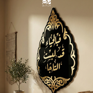 “إشراقةُ وقارٍ تُزين زوايا غرفتكِ. تتألق على جداركِ بعبارة ‘فبالحياء قد لبست التاجا..’، لتكون انعكاساً لجمال روحكِ كل يوم 🌿. تهمس لكِ بأن زينتكِ الحقيقية هي حشمتكِ، وبها تبلغين عنان السماء رُقياً 🤍. فخامة الأسود مع بريق الذهب.. لتكتمل بها تفاصيل مساحتكِ الراقية.”