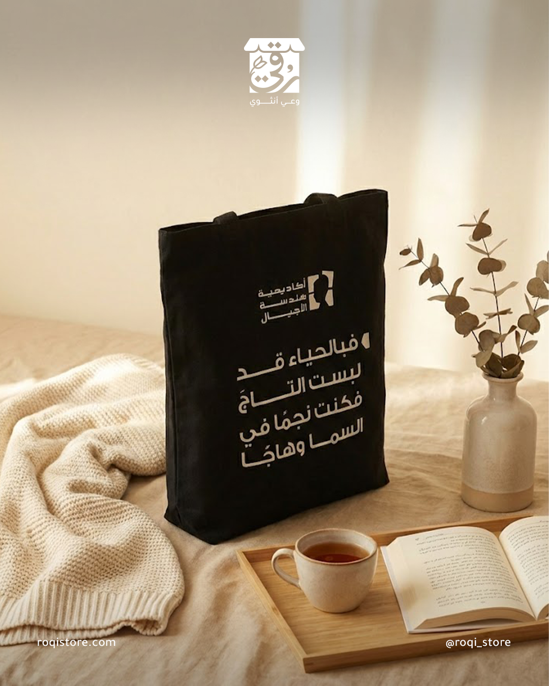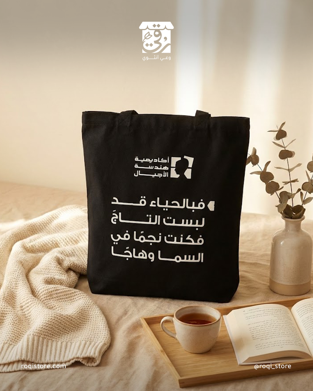 “رفيقةُ دربكِ التي تنطق بجمال روحكِ. ترافقكِ في خطواتكِ بعبارة ‘فبالحياء قد لبست التاجَ.. فكنت نجماً في السما وهاجاً’، لتكون رسالتكِ الصامتة في كل مكان 🌟: تُذكّركِ بأن زينتكِ الحقيقية هي حياؤكِ، وأنكِ به تشرقين كالنجمة العالية 🤍. مساحة عملية وأناقة باللون الأسود الملكي.. تليق بامرأةٍ تتوجت بالرقي 🌿.”